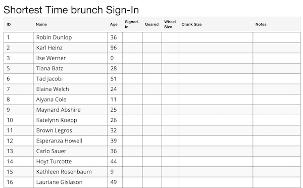 If the competitors all start at the same time, but you want to be able to mark down "Did Not Start" or other details (like crank size, or geared Y/N?) you may want to choose "Sign in List Enabled". If the competitors don't all start at the same time, you will probably have one of the following situations: