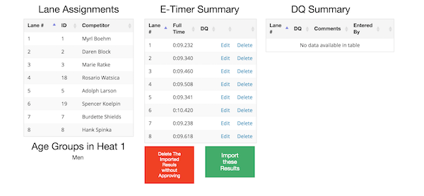 At the track, a track official can use an iPad to confirm the competitors are present for their heats. This same view can also be useful for the E-Timer person, so that they can confirm that they are recording entries for the correct number of competitors and the correct lane numbers.